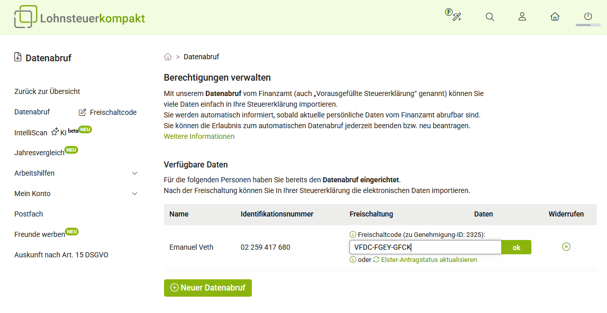 Dacă aveți deja codul de acces pentru ELSTER, puteți continua imediat cu activarea accesului la date prin Lohnsteuer kompakt.